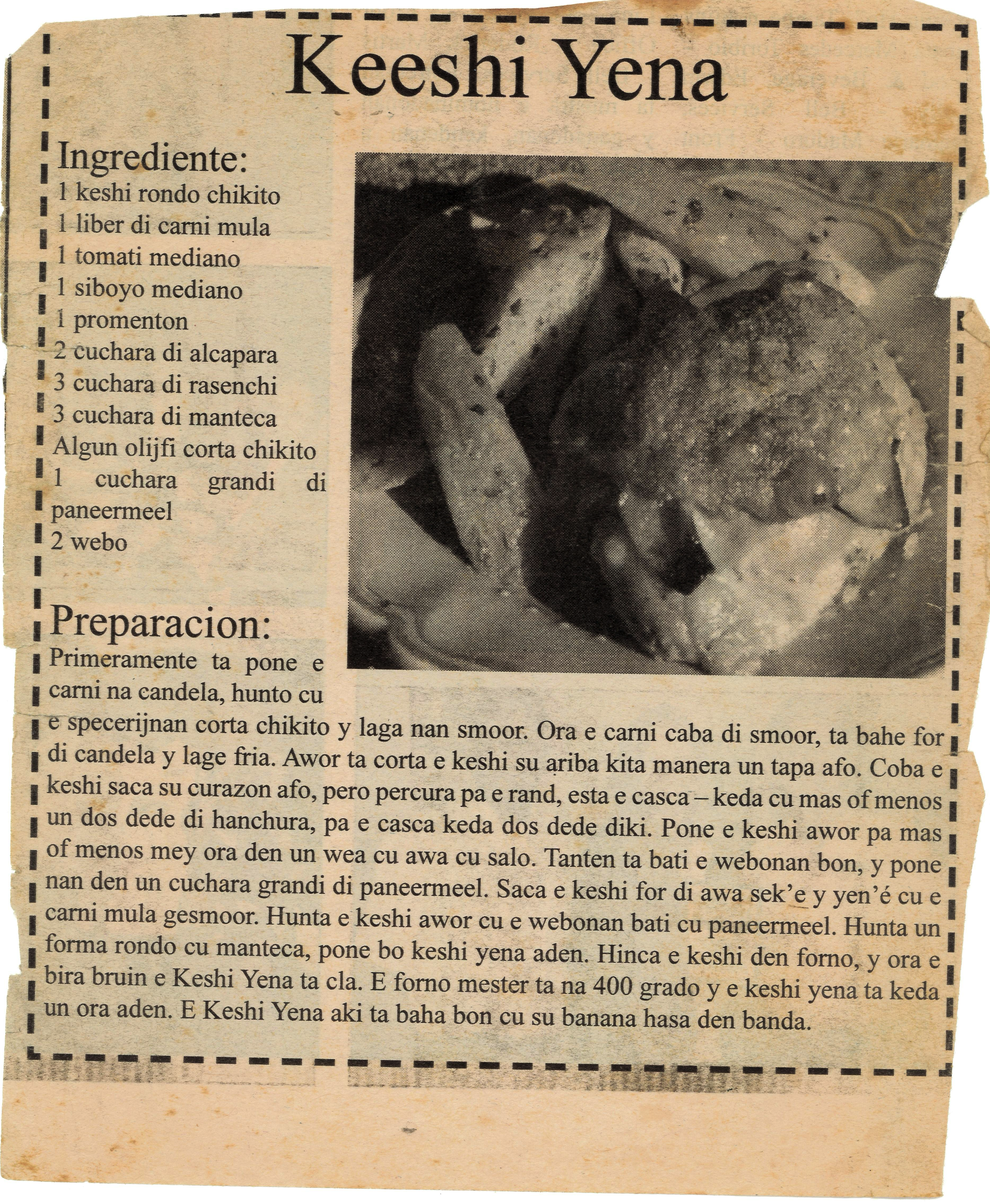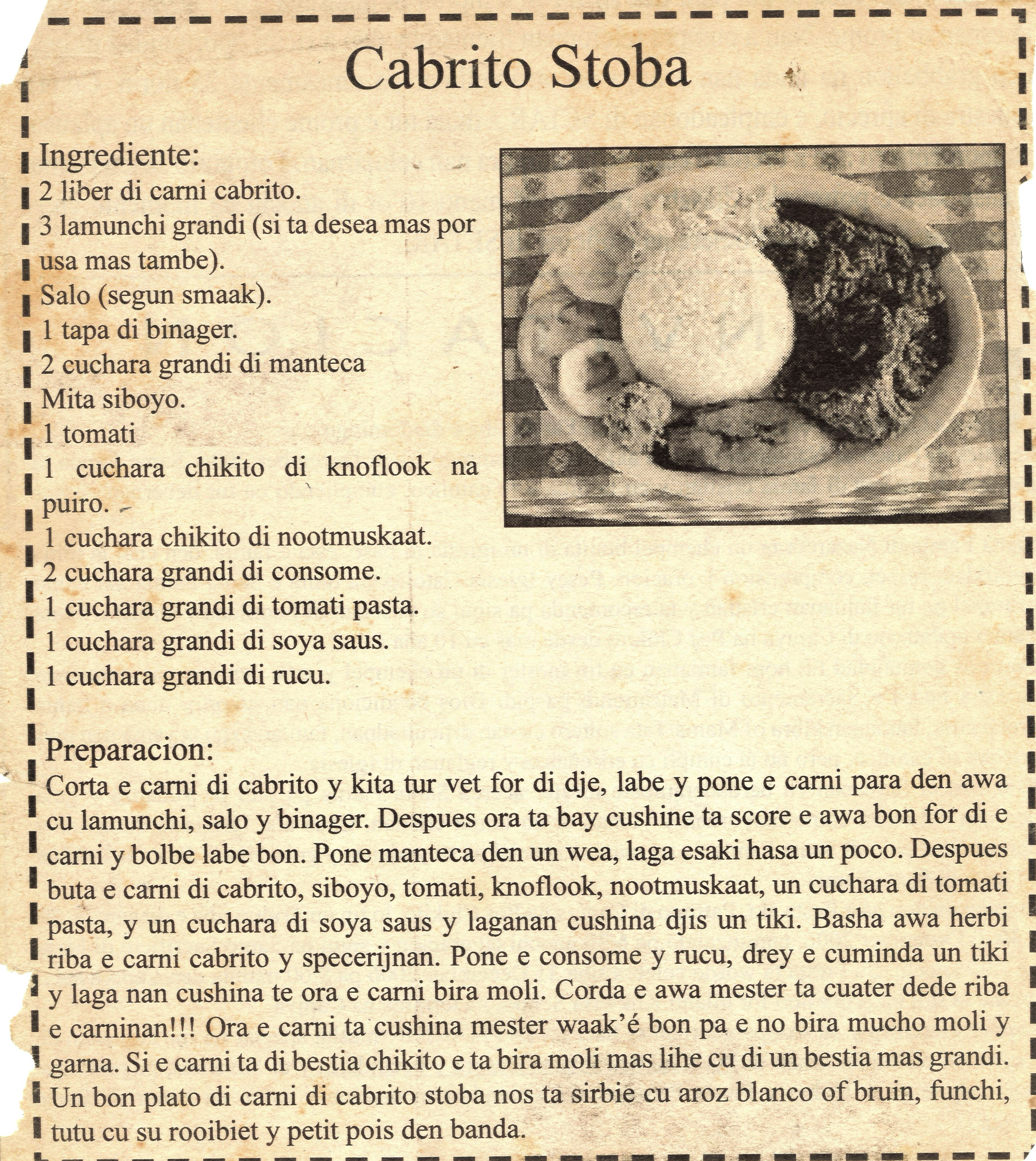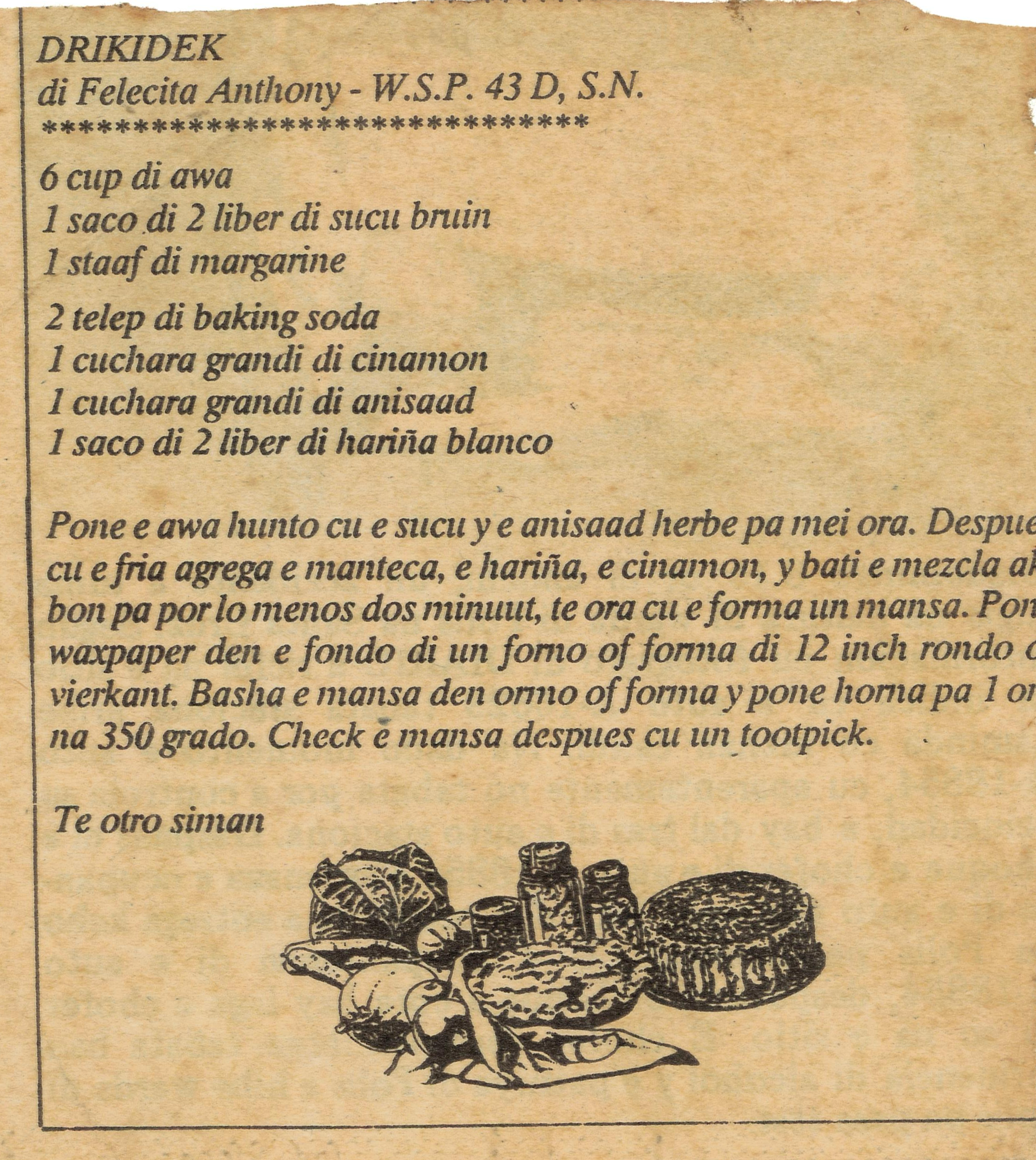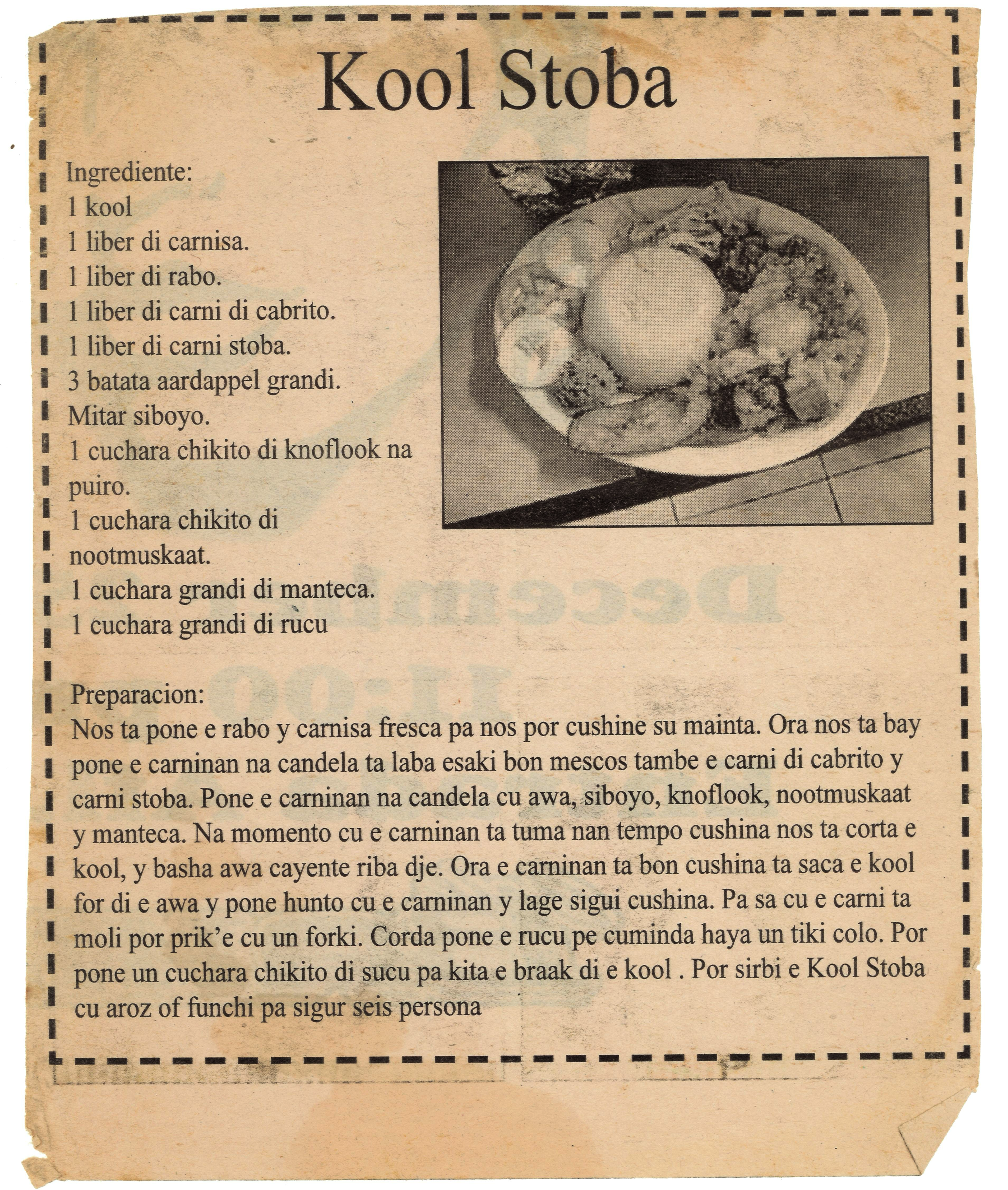 Hopi di e recetanan presenta aki a keda conserva durante decadanan a traves di recortenan di corant warda pa Sra. Rosaura Semeleer-Quandt y su mama, Sra. Sophia Quandt—un muher Arubano stima y conoci pa su lesnan popular di cushinamento y su rol den siña generacionnan e arte di cushina local.