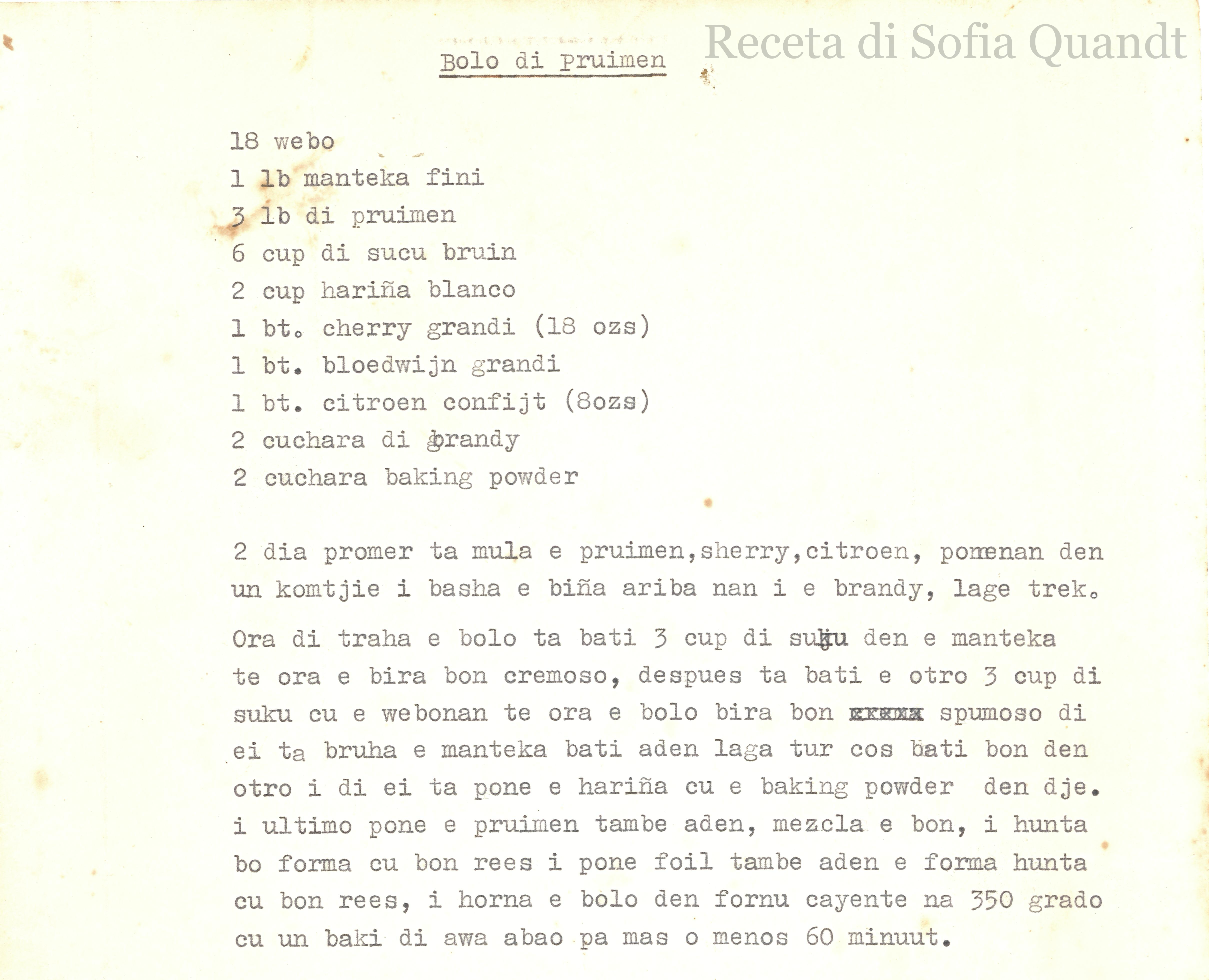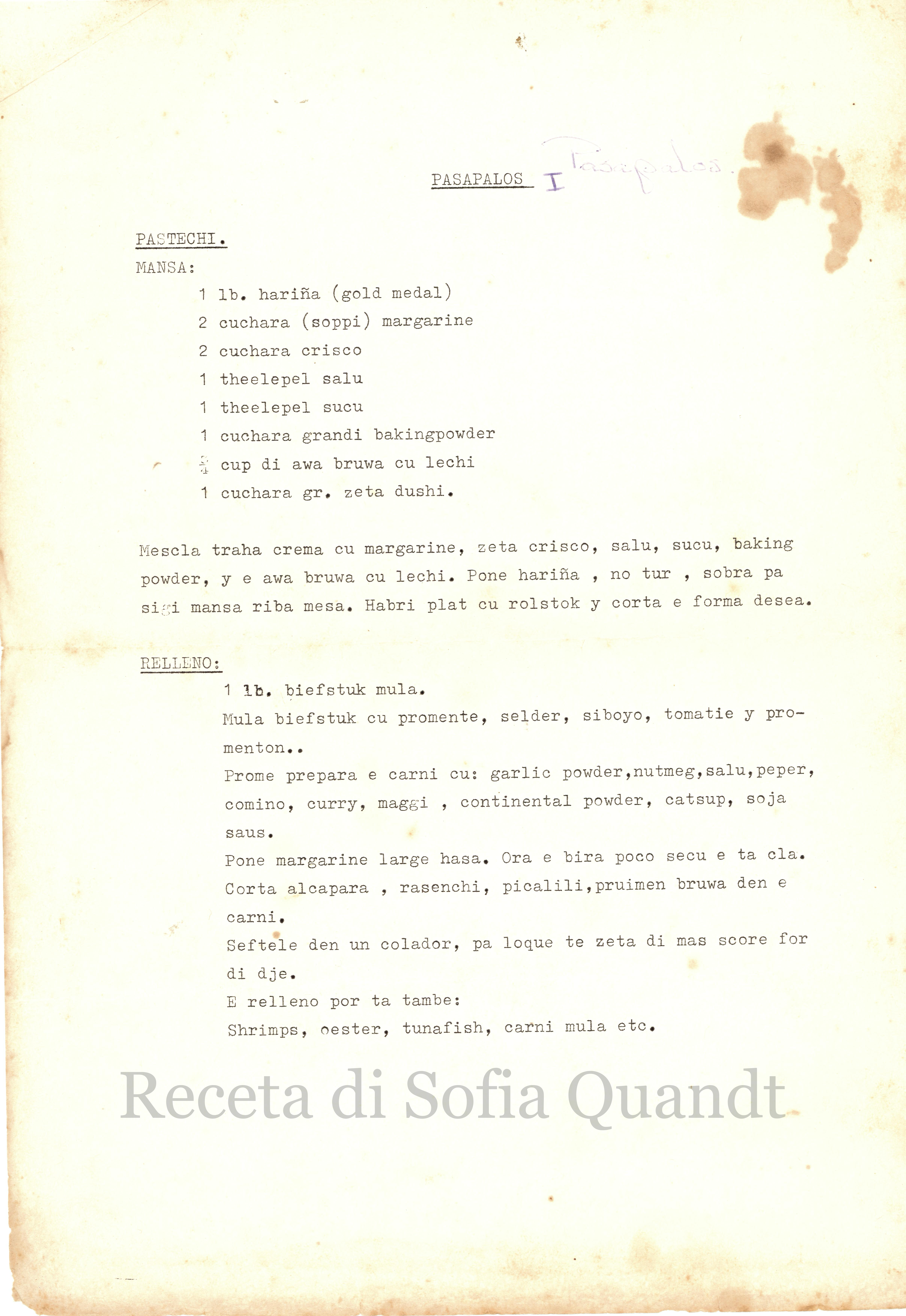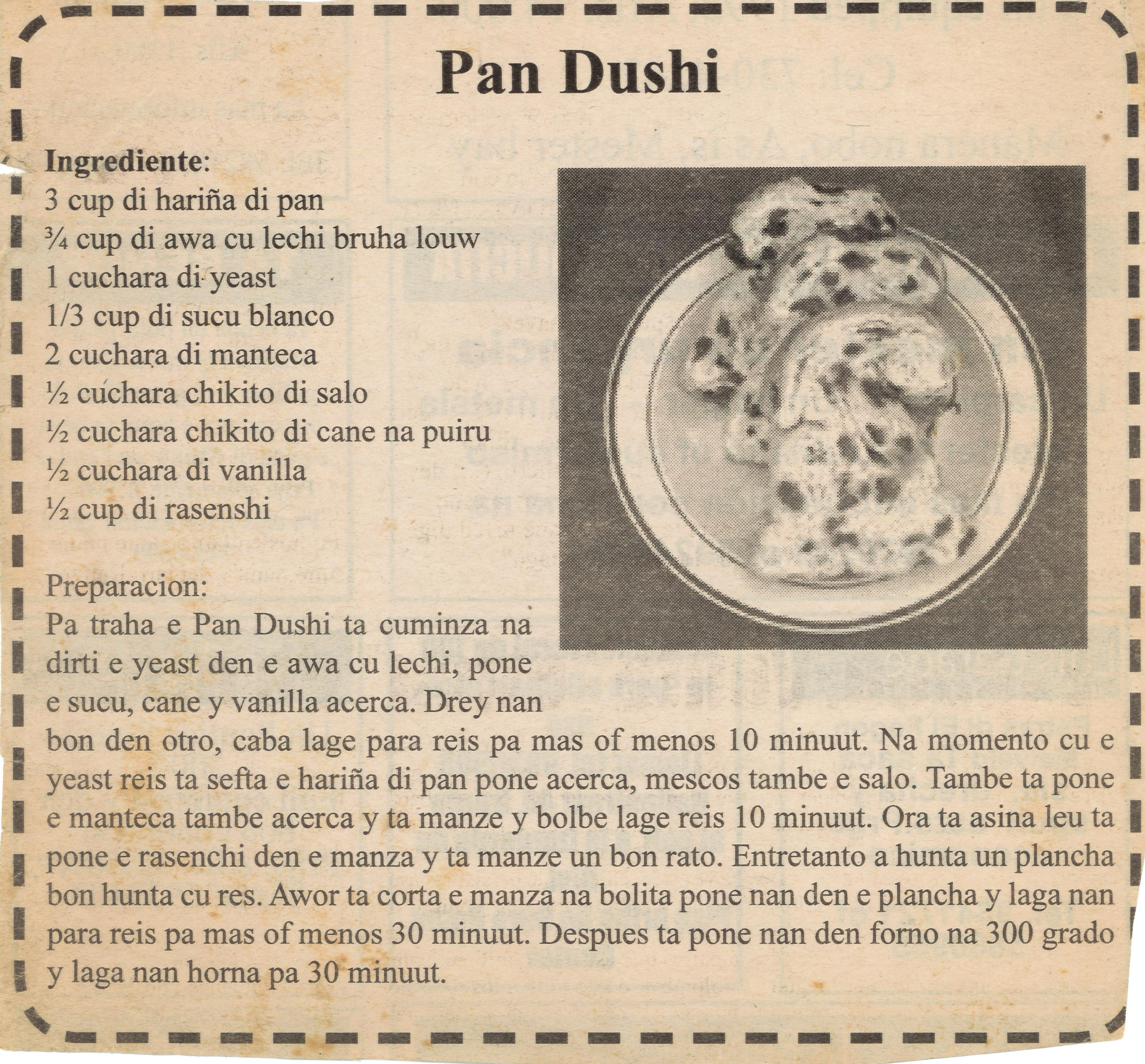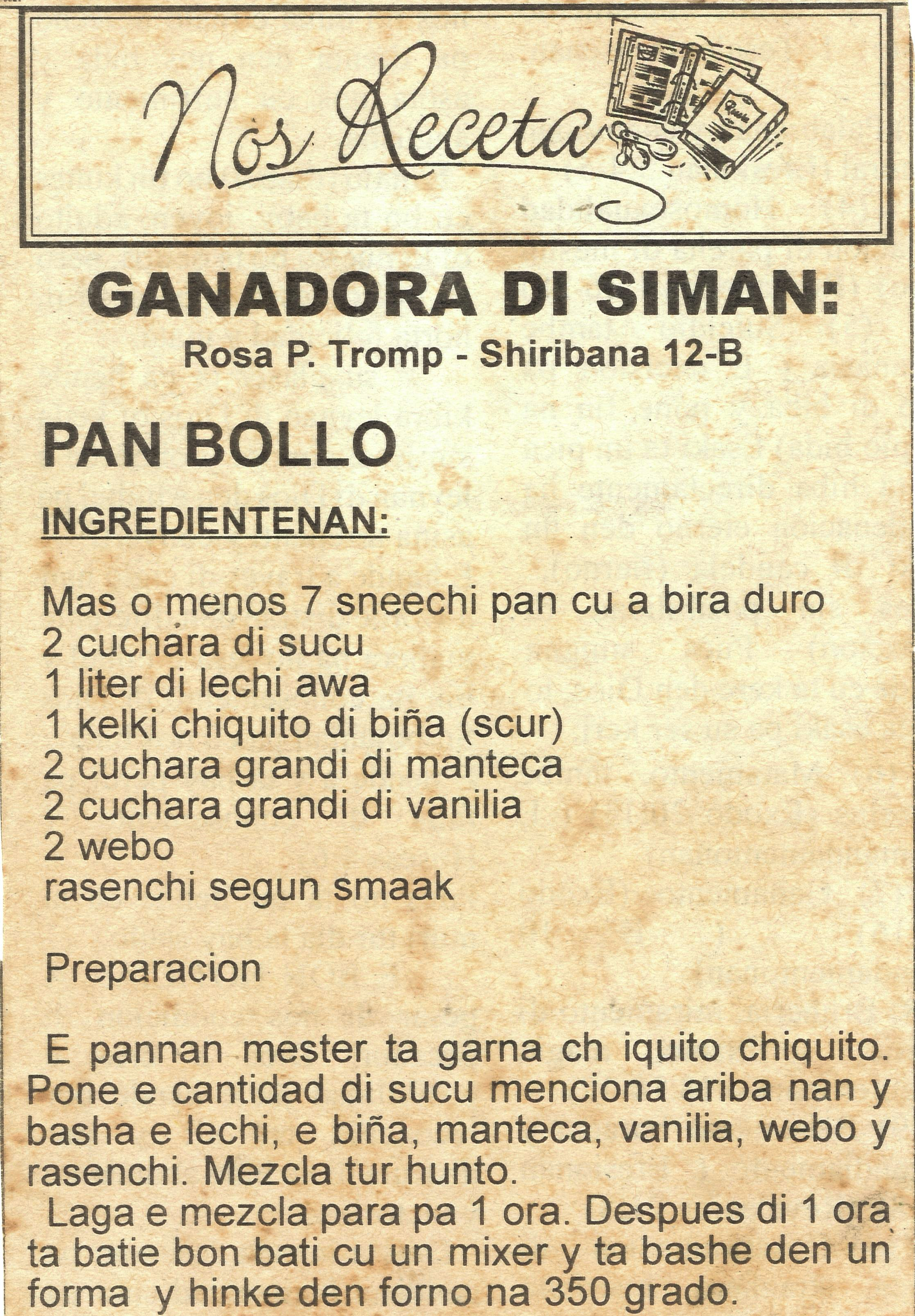Hopi di e recetanan presenta aki a keda conserva durante decadanan a traves di recortenan di corant warda pa Sra. Rosaura Semeleer-Quandt y su mama, Sra. Sophia Quandt—un muher Arubano stima y conoci pa su lesnan popular di cushinamento y su rol den siña generacionnan e arte di cushina local.