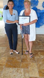 Ms. Candace Gumbs, representing the Aruba Tourism Authority, along with staff members of Divi Aruba Phoenix Beachfront Resort, presented the certificate, offered gifts, and expressed heartfelt thanks to the honoree for choosing Aruba as her favorite vacation destination, her home away from home.